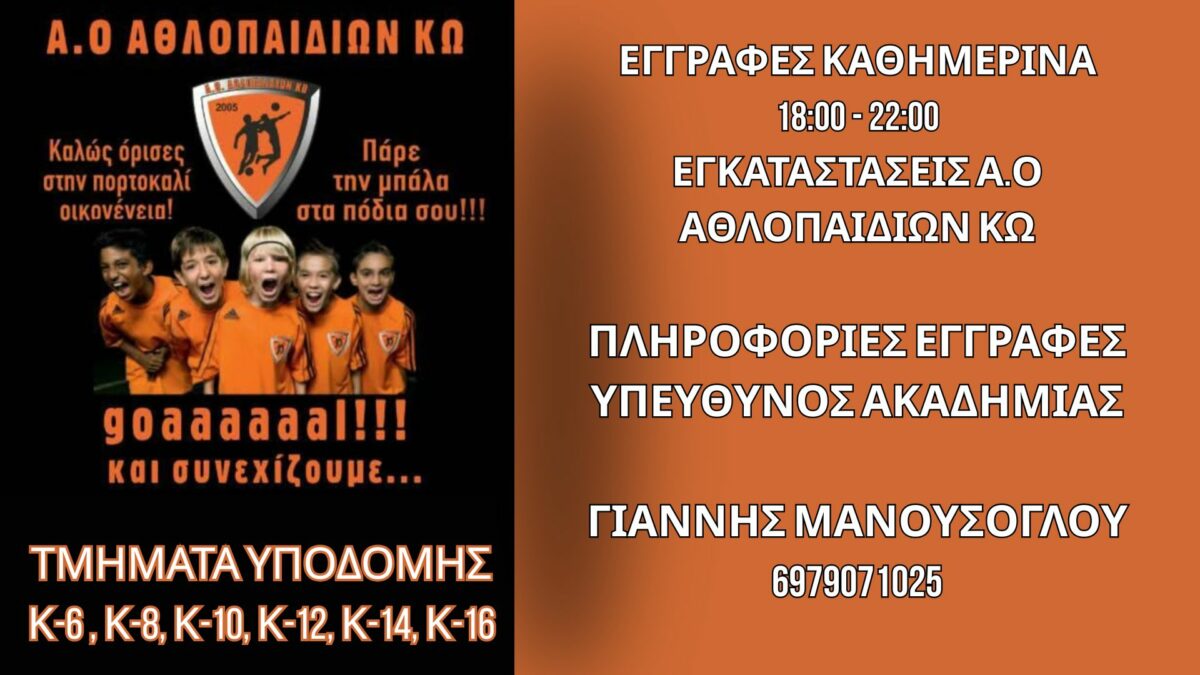 Η νέα ποδοσφαιρική σεζόν ξεκινά δυναμικά για τον Α.Ο. Αθλοπαιδιών Κω! Από τη Δευτέρα ξεκινούν οι προπονήσεις όλων των τμημάτων υποδομής, ενώ οι εγγραφές συνεχίζονται καθημερινά για μικρούς αθλητές που θέλουν να γίνουν μέλος της «πορτοκαλί οικογένειας».